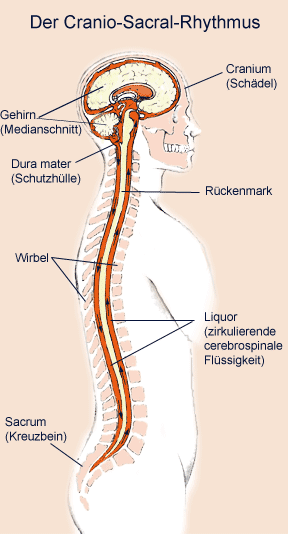Der Schädel bildet mit der Wirbelsäule, den Gehirn- und Rückenmarkshäuten sowie der Gehirn- und Rückenmarksflüssigkeit das Craniosacrale System. Durch die rhythmische Produktion und Resorption der Flüssigkeit (Liquor) entsteht der Craniosacrale Rhythmus. Diese sehr feine Bewegung setzt sich vom Schädel über die Wirbelsäule zum Kreuzbein fort und überträgt sich auf den gesamten Körper.